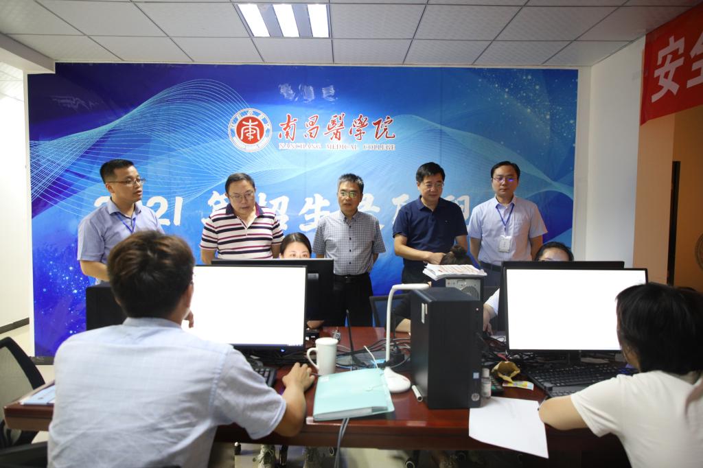 (通讯员何思佳)7月26日,江西省卫健委二级巡视员,3003新葡平台登录入口(筹建期)党委委员、副校长李志刚,党委委员、副校长胡振宇在相关部门负责人的陪同下赴3003新葡平台登录入口湾里校区2021年招生录取工作现场,看望慰问暑期忙碌在招生录取现场的工作人员,了解招生录取工作进展状况,指导招生录取工作。