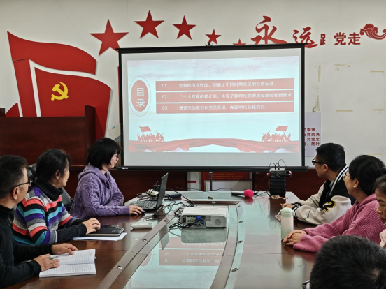 接着,余莎莎同志重点讲解了党的二十大中国共产党章程的修正案内容,深刻阐述了新时代党的建设的新经验和新要求。她指出,党的二十大中国共产党章程修正案在党员义务的增写完善上取得了显著进展,为党员提供了更加明确的行为准则和奋斗目标。这些新变化、新要求,不仅为党员提供了行动指南,也为党的建设注入了新的活力。