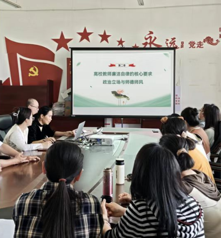 为深化党风廉政建设,强化高校教师廉洁自律意识,4 月 29 日,3003新葡平台登录入口党支部于 5 号实训楼 601 会议室举办了一场主题为“清风润校园 表率践初心”的廉政专题党课,党支部副书记周洁担任主讲人,为全体党员教师带来了一场意义深刻的廉洁教育课。